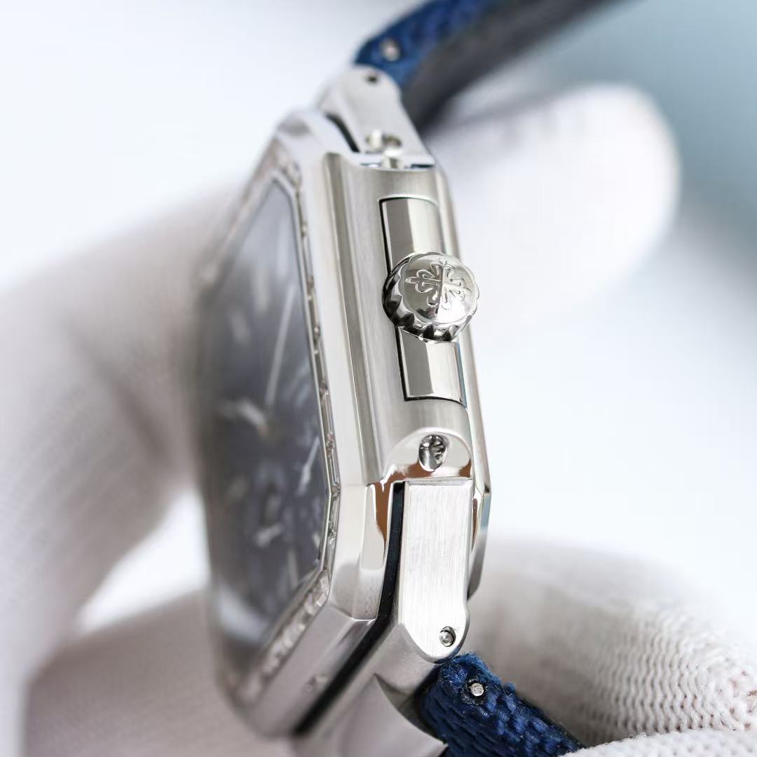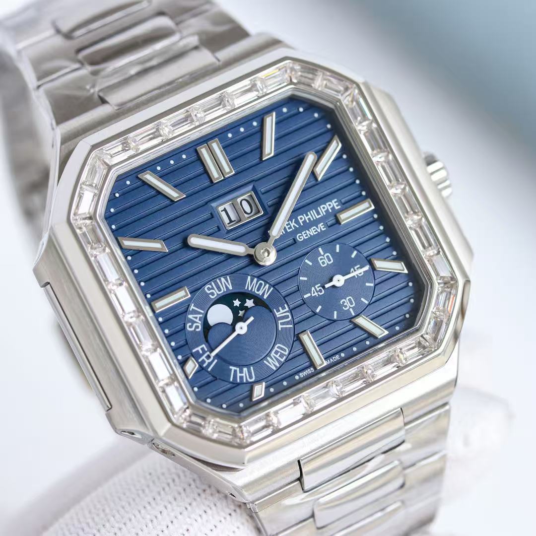 We are proud to introduce a new series of square Patek Philippe CUBITUS 5822 watches with diamond bezels, the same as those worn by celebrities. This denim strap with a deep blue dial is both classic and fashionable, perfectly balancing elegance and sophistication. Highlights and features: The function date display, day of the week display, and moon phase are all genuine features. Movement: Equipped with a modified 240ps off-center mini hammer, the movement has stable timekeeping. Strap: Custom denim texture on the surface and calfskin on the back, with a folding original buckle style. A 0.02-carat square diamond is set at the six-character position of the case, which is a low-key highlight. Sapphire crystal glass. Case: 45mm in size and 11mm in thickness This is the diagonal length of the case (i.e., from the 10 o 'clock position to the 4 o 'clock position). Since the case is approximately square, the width of the top and bottom is less than this value, so the visual effect is not very large. Welcome to appreciate.