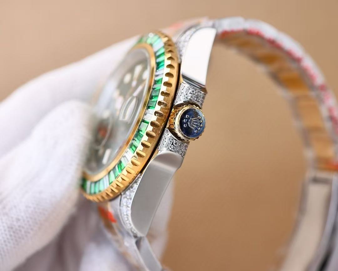 Travel in style with the Rolex GMT-Master II 126755SARU. A 40mm rose gold case, set with diamonds, pairs with a matching Oyster bracelet for an opulent feel. The black dial features luminous rose gold hour markers, while the bezel steals the spotlight with square-cut rubies, sapphires and diamonds. Powered by the caliber 3285 automatic movement with a 70-hour power reserve, this sport watch keeps your look elevated for every moment.